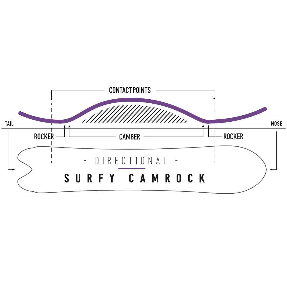 - Profil: Surfy Camrock – Vorspannung bis in den äußeren Bindungsbereich, Rocker Tips
